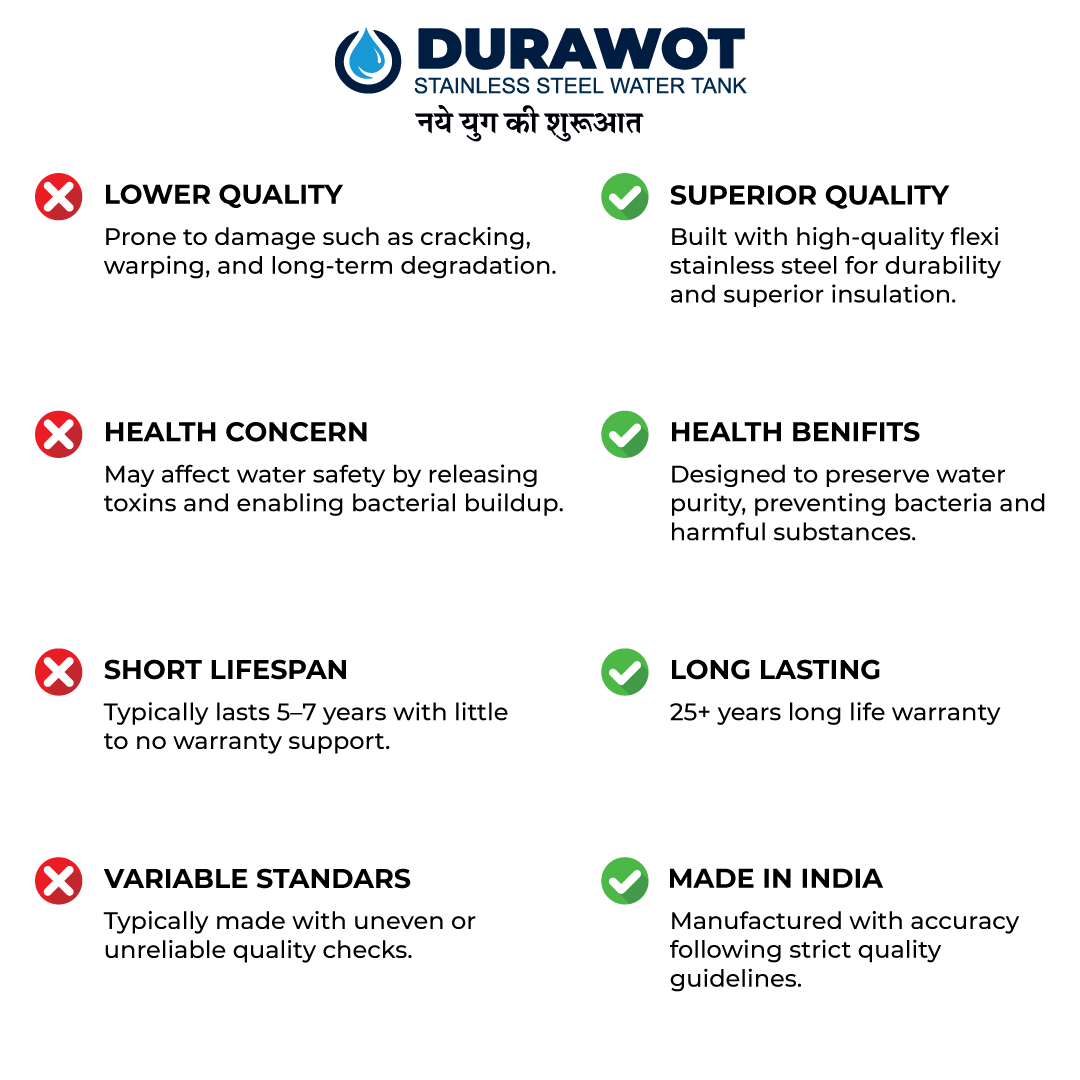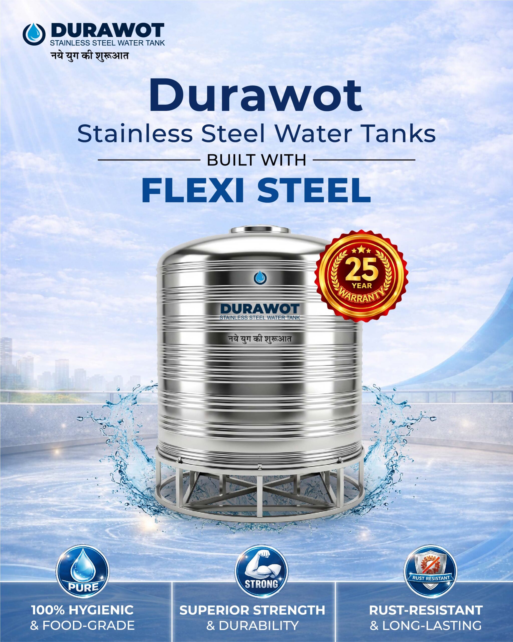 The Durawot Flexi Steel Water Tank is designed to be as strong, long-lasting, and clean as possible for homes and businesses. This tank is made from high-quality stainless steel, imported from Vietnam, ensuring superior durability, corrosion resistance, and long-term performance even in tough conditions.